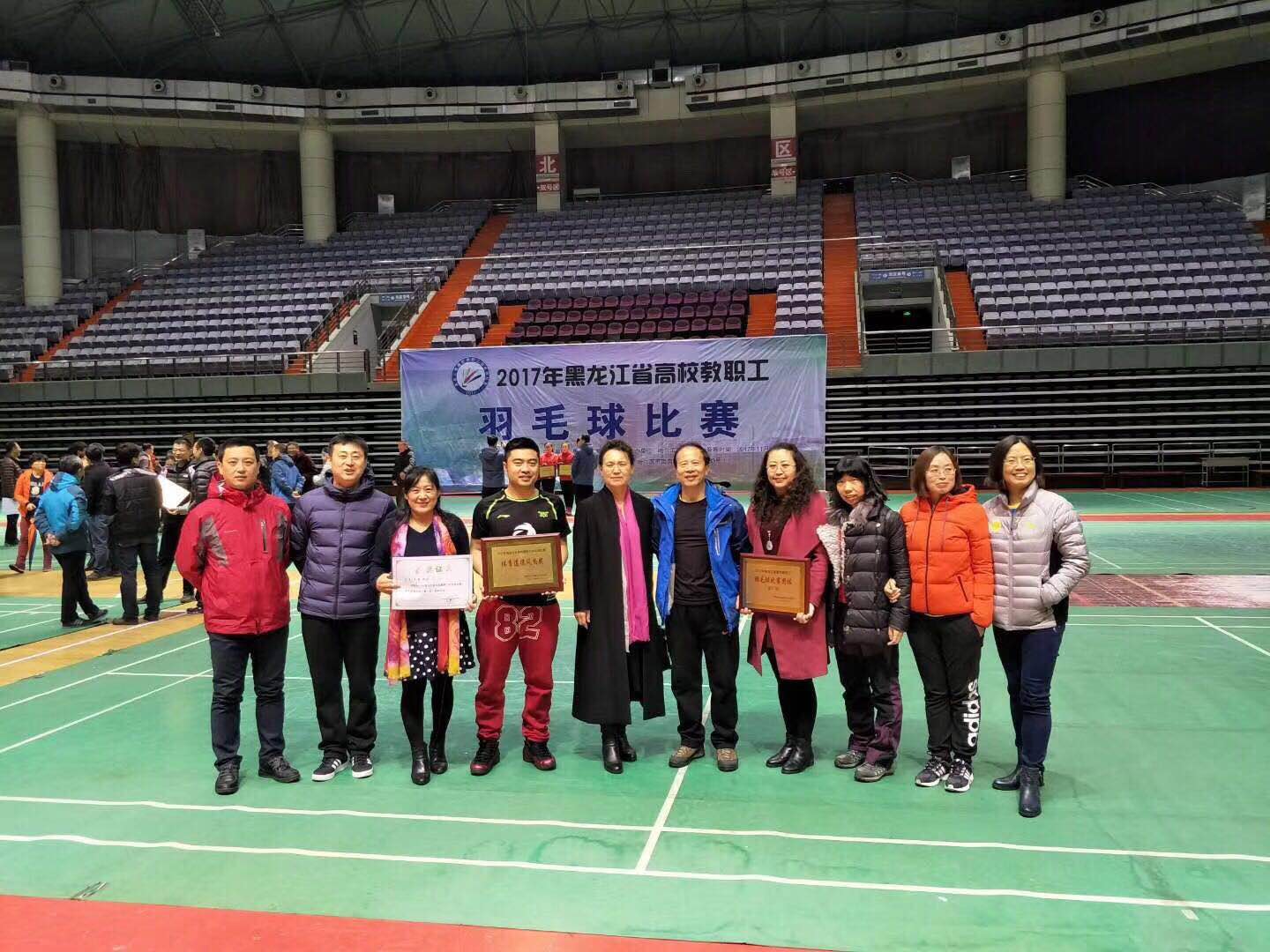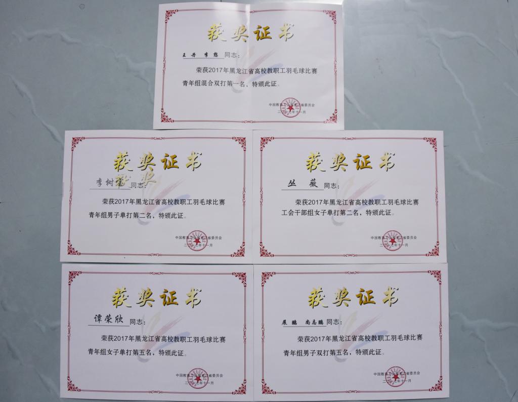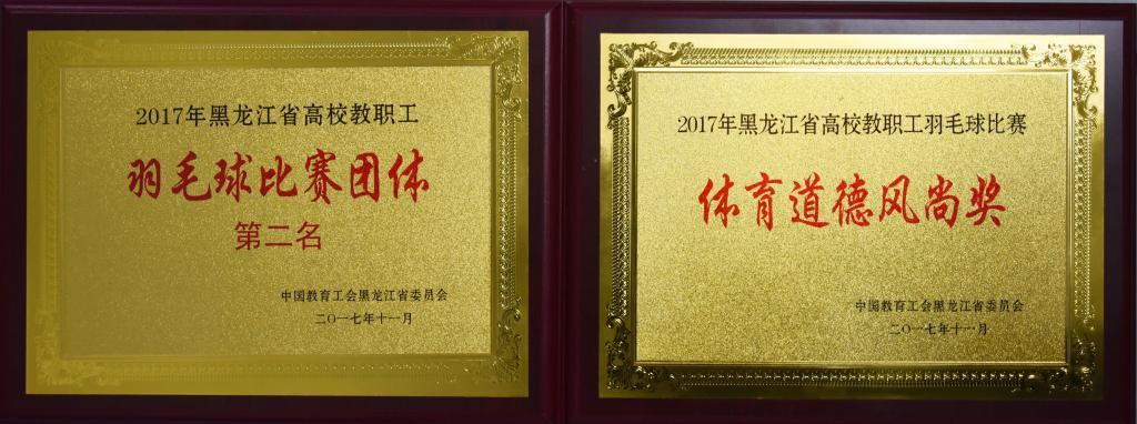 11月9日至10日,由黑龙江省教育工会主办的全省高校教职工羽毛球比赛在哈尔滨理工大学体育馆进行。全省高校有25支代表队、380余名教职工参赛,参赛代表队和教职工人数创造了历史新高。经过全体参赛教职工的奋力拼搏,我校取得团体亚军、李想、王丹获得青年组混双冠军、李树宝获得青年组男子单打亚军、丛微获得工会干部组女子单打亚军,展鹏、尚志鹏获得男双单项第五名、谭荣欣获得女单单项第五名的好成绩,学校荣获体育道德风尚奖。