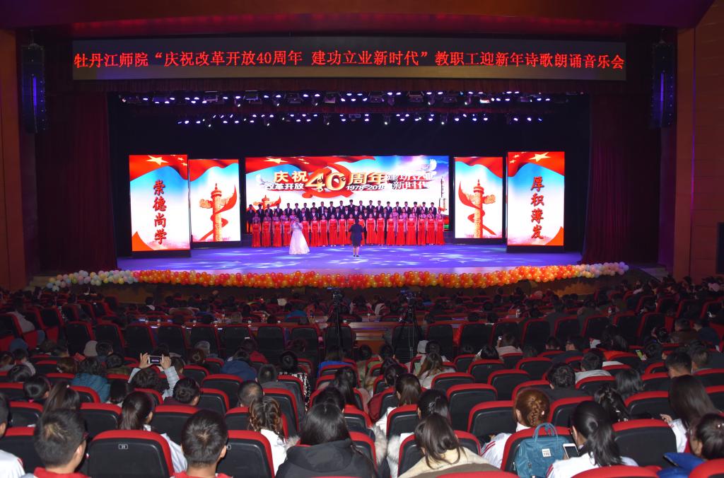 “改革开放四十年,春潮不息;中华腾飞九万里,大鹏正举。”12月26日下午,牡丹江师范学院第一音乐厅歌声悠扬,琴声荡漾。学校党政领导王育伟、梁中贤、杨春文、李旭中、刘峰、杨敬民、张艳霞、张冬、秦植林,以及各院、部、处、办的领导和全校教师及学生代表欢聚一堂,共同观看“庆祝改革开放40周年·建功立业新时代”牡丹江师范学院教职工迎新年诗歌朗诵音乐会。