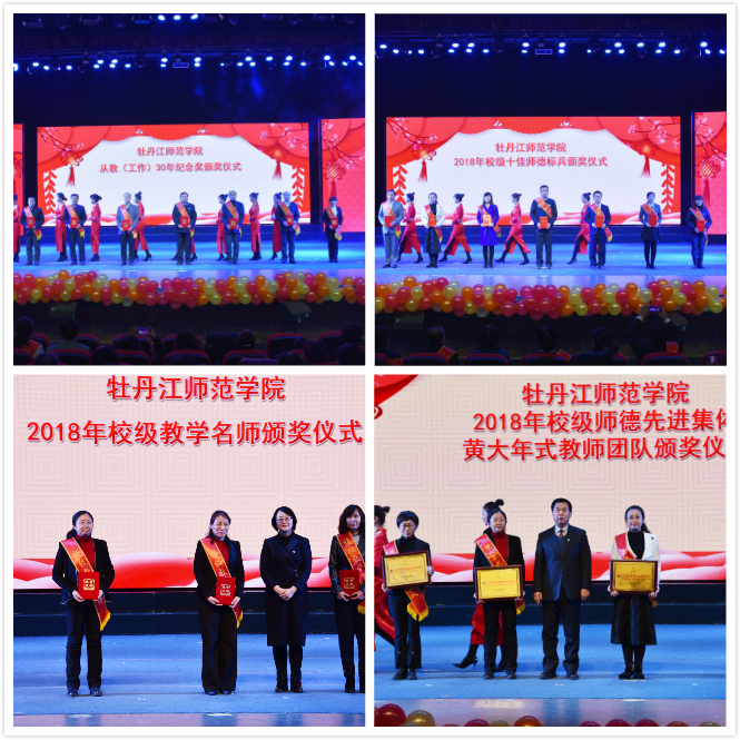 晚会上,学校对“从教(工作)30年教师代表”“2018年校级十佳师德标兵”“2018年校级教学名师”“2018年校级师德先进集体”及“牡丹江师范学院黄大年式教师团队”进行表彰,树立了教师队伍良好形象,充分发挥了先进典型的示范引领作用,营造了人人争做有理想信念、有道德情操、有扎实学识、有仁爱之心的“四有”好老师的良好教风。表彰他们用心教书、以德施教,为学生插上梦想的翅膀,他们崇高的师德、专业的素养、无私的奉献,彰显了震撼心灵的力量。